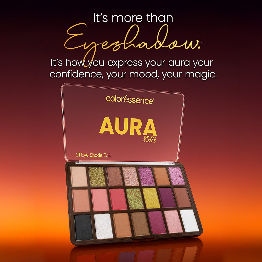 The Aura Eyeshadow Palette features 21 highly pigmented shades designed to create effortless eye looks for every mood and occasion. From soft everyday glam to bold, dramatic styles, this palette offers a perfect mix of matte, shimmer, and metallic finishes that blend smoothly and stay vibrant for hours.